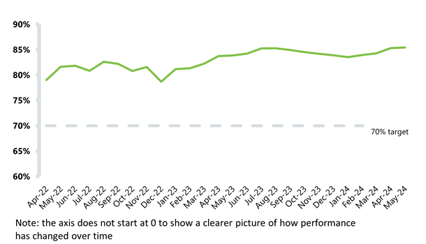 The 2023/24 priorities and operational planning guidance set out a national objective for trusts to consistently meet or exceed the 70% two-hour urgent community response (UCR) standard. Trusts met this standard every month recorded in the dataset. As of May 2024, 85% of UCR referrals met the two-hour standard for delivering UCR services, maintaining the improvements seen over the previous four months. The target has been met across most reporting trusts: 78 out of 88 reporting trusts met the 70% target in May and 26 of 91 trusts delivered UCR services within the two-hour window to 90% of patients.