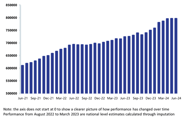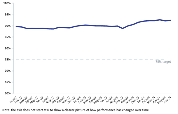 Progress is being made in other areas such as NHS talking therapies as services continue to meet the key national target. In May 2024, 92.2% of referrals who finished a course of treatment in the month accessed NHS talking therapies within six weeks, meeting the national standard of 75%. Most trusts are meeting the target as 39 out of the 40 reporting NHS trusts met the target this month.
