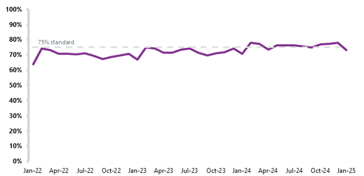 • After meeting the 28-FDS pathway standard (75%) for the last two months, performance fell short in January (73.4%) and moved further away from the upcoming March 2025 target of 77%.