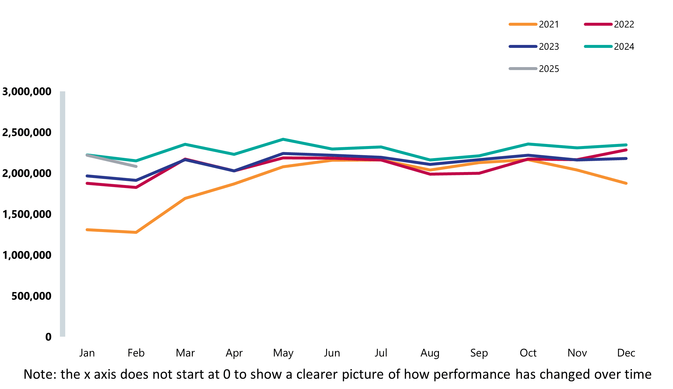 A&E attendances in February (2.08 million) were lower than last month and last year but contributed to the busiest winter period on record (6.65 million across December 2024 to February 2025 combined).