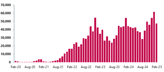 • January 2025 saw the second highest number of diagnostic tests on record: 2.51m. This is 12% more tests than last month, 7.4% more than last year and over 20% higher than pre-pandemic levels.