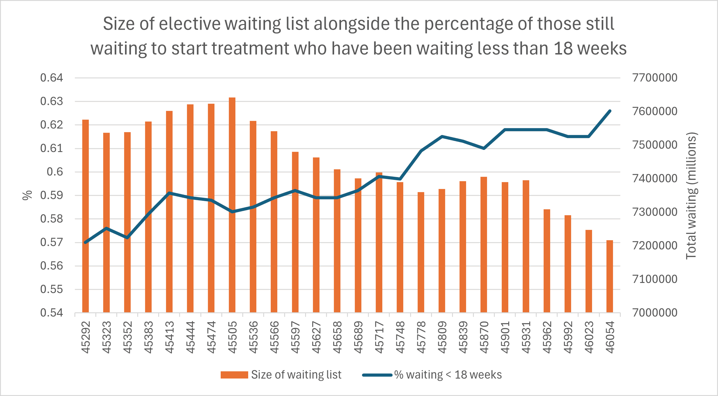 - The size of the waiting list decreased to 7.22 million in February, compared with 7.25 million in January. This is notably lower than the 7.40 million in February 2025, but the list remains significantly higher than before the pandemic (4.57 million in February 2020). The progress seen on reducing the elective waiting list since January 2024 is shown in Figure 2.