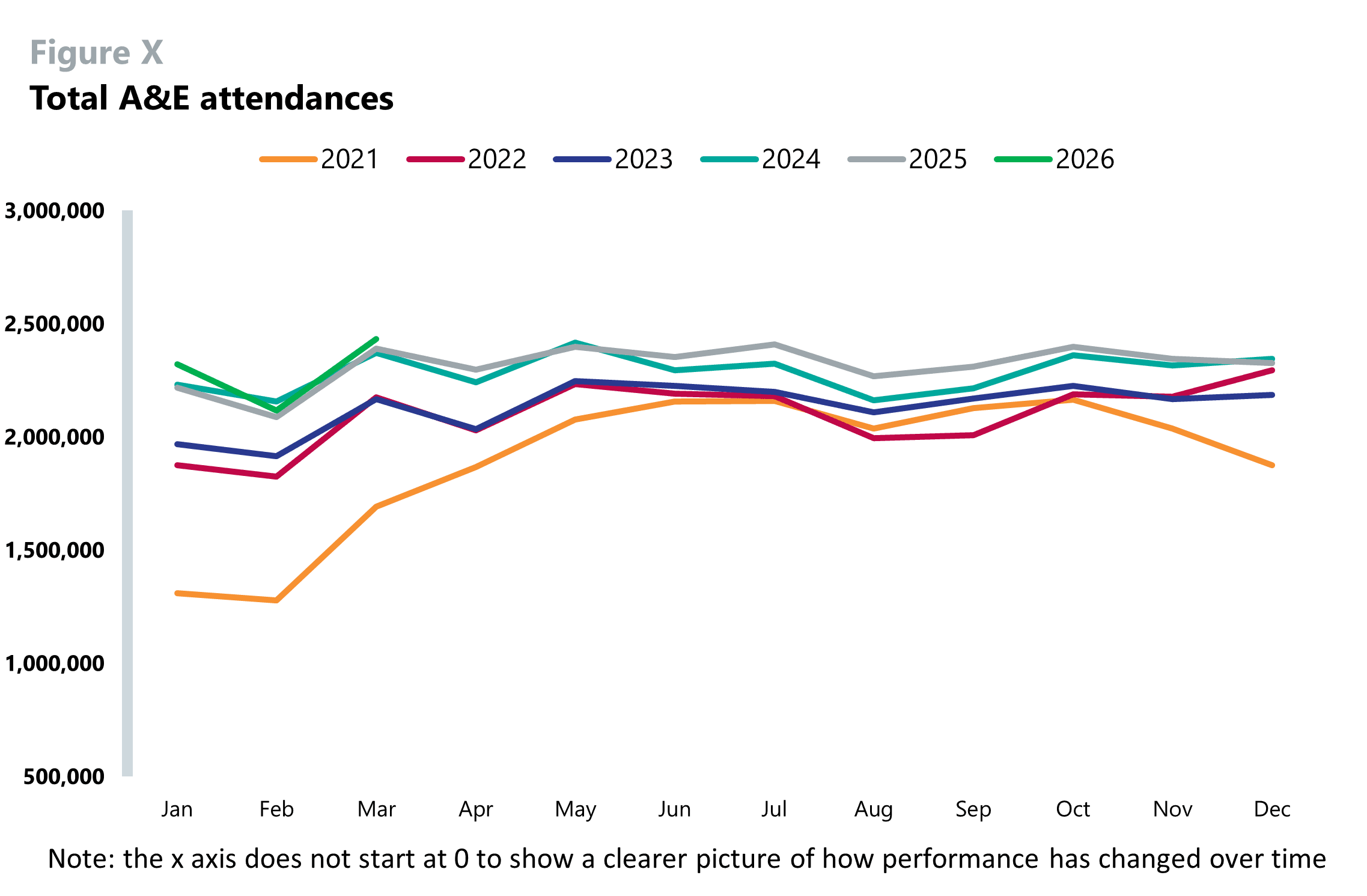 - There were a record breaking 2.43 million A&E attendances this month, compared with 2.12 million in February. This value stood at 2.39 million in March 2025. This is the highest figure since records began in August 2010. This is shown in Figure 1.