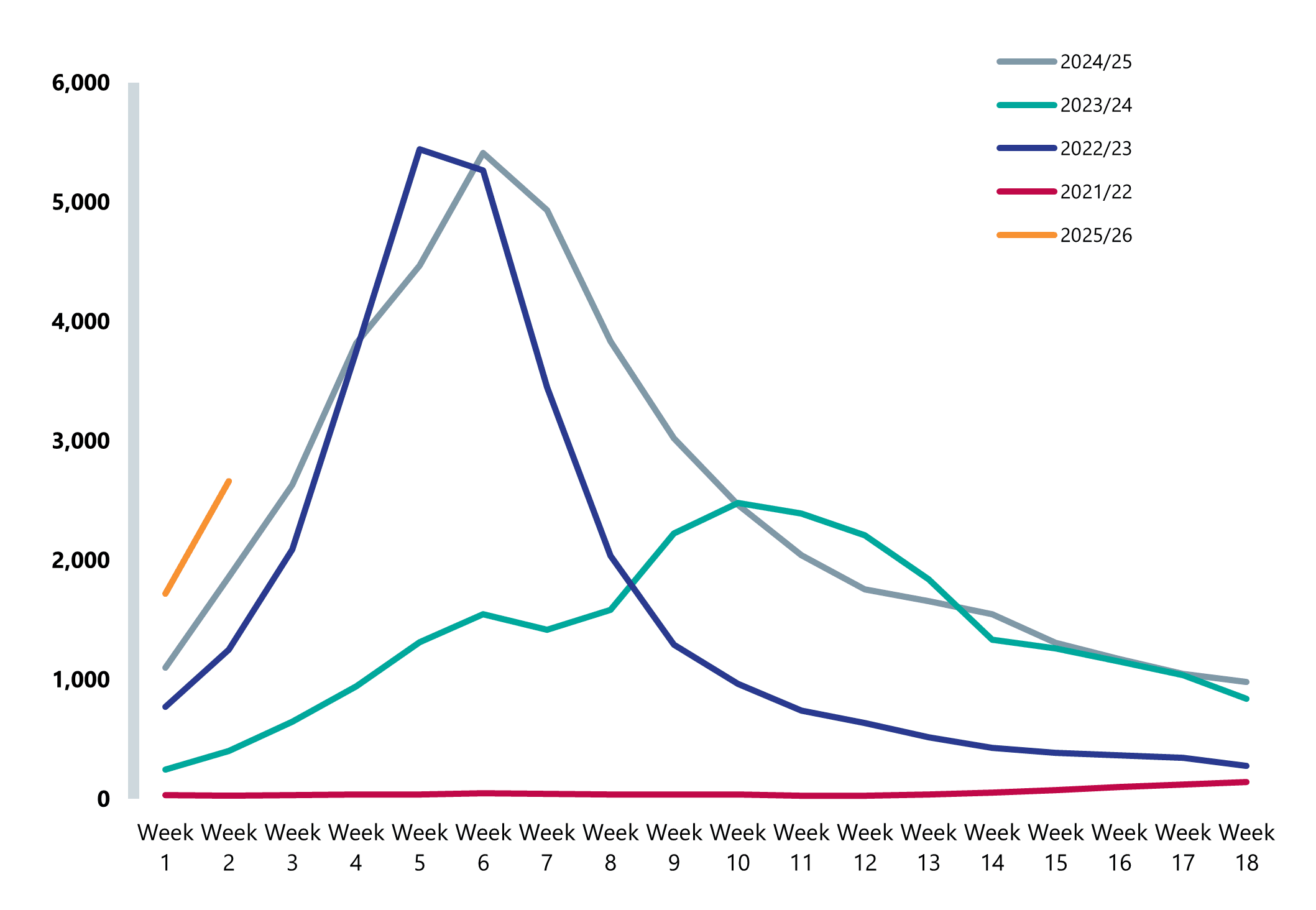 D&V: The number of beds closed due to D&V and norovirus has risen by 41% over the first two weeks of winter 2025/26 to 447, on average, each day. But figures are consistently lower than last year (down 56% in the latest week).